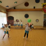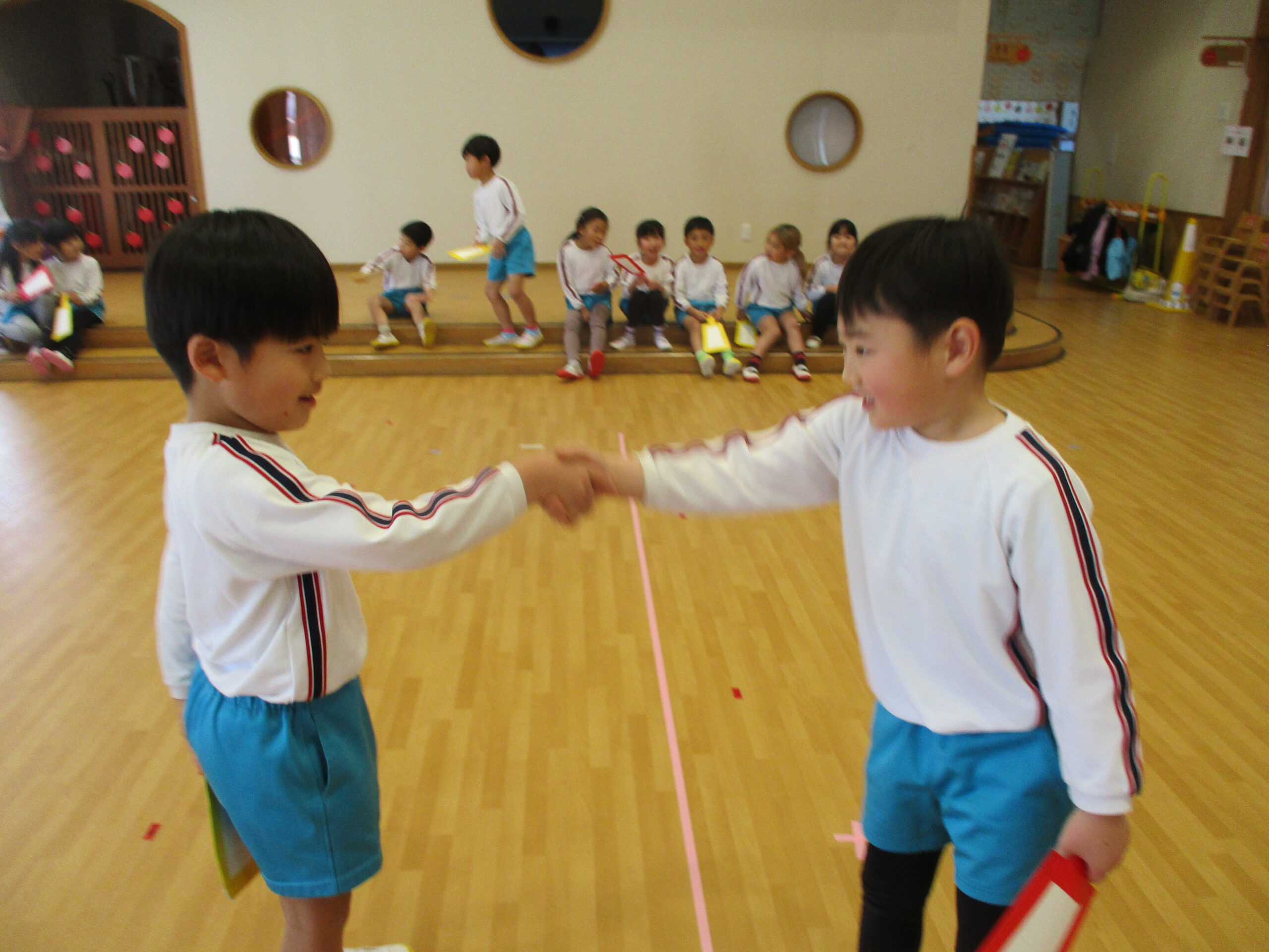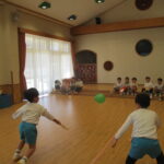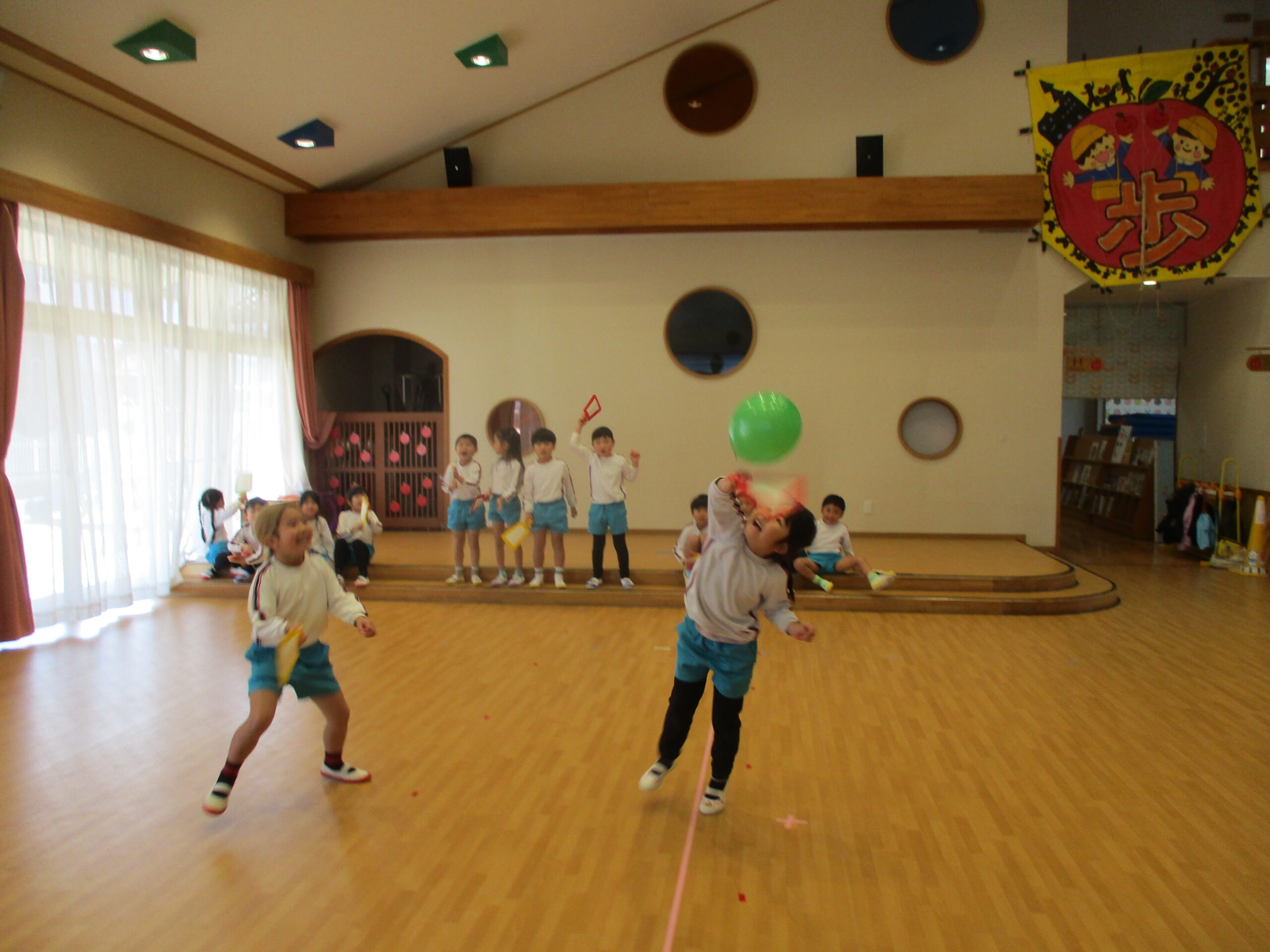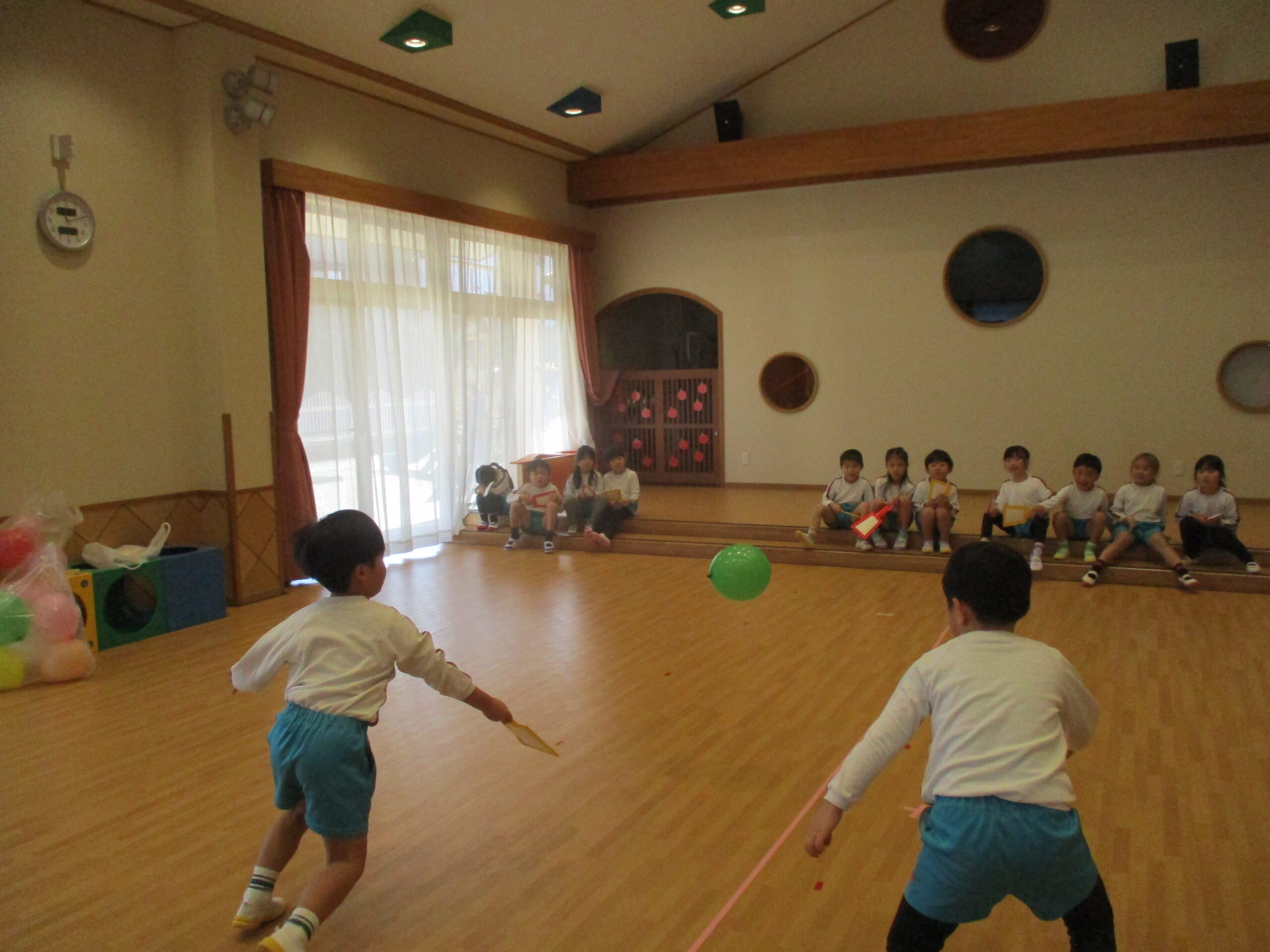 室内では風船羽根つきをしています。