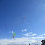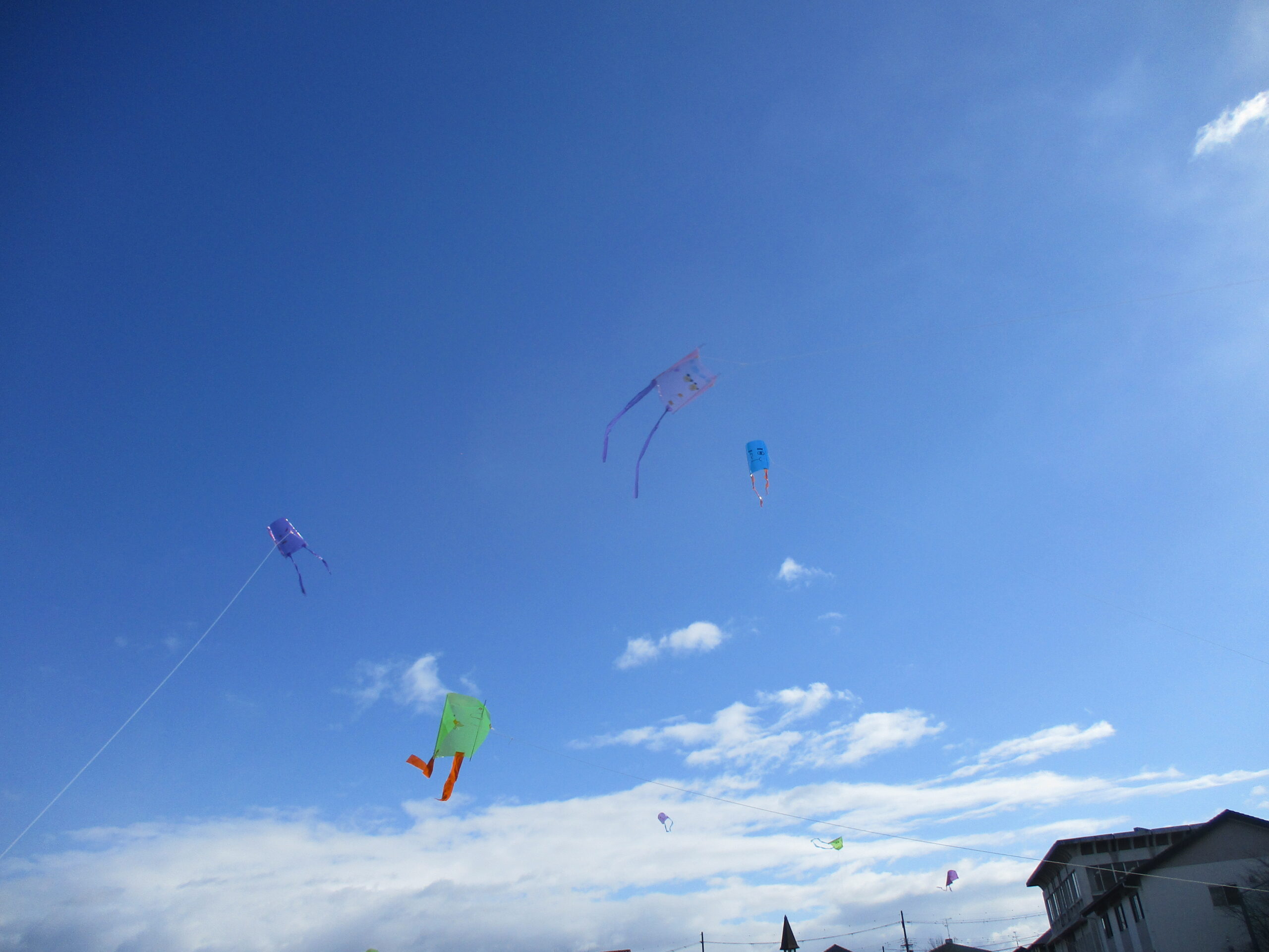 5くみの凧は色とりどりです。